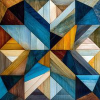 Farbenfrohe geometrische Abstraktion mit Holzstruktur.