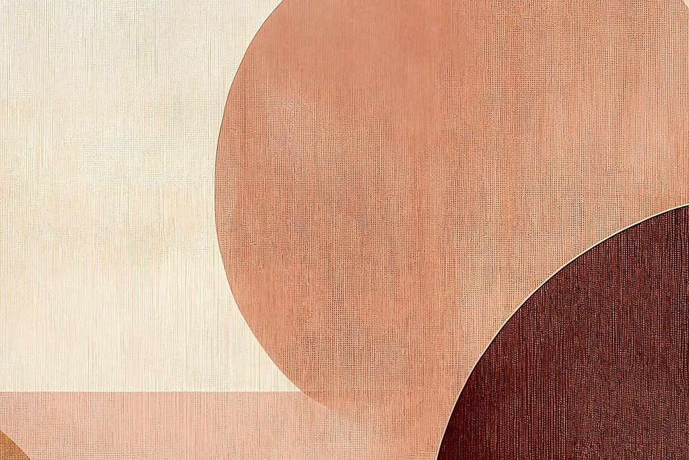 Dieses abstrakte Kunstwerk strahlt durch geometrische Formen in einer warmen, erdigen Farbpalette Ruhe und Harmonie aus. Überlappende Kreise und Rechtecke in Rosa, Braun, Schwarz und Beige bilden eine ausgewogene Komposition. Texturen sorgen für Tiefe, während sanfte Farbübergänge Gelassenheit hervorrufen. Das minimalistische Design erinnert an eine stilisierte Landschaft. Dieses elegante Werk lädt Sie ein, die Schönheit der Einfachheit und Harmonie in abstrakten Formen und erdigen Farben zu betrachten.