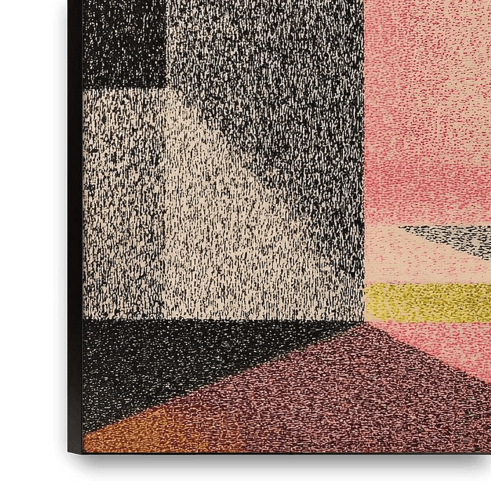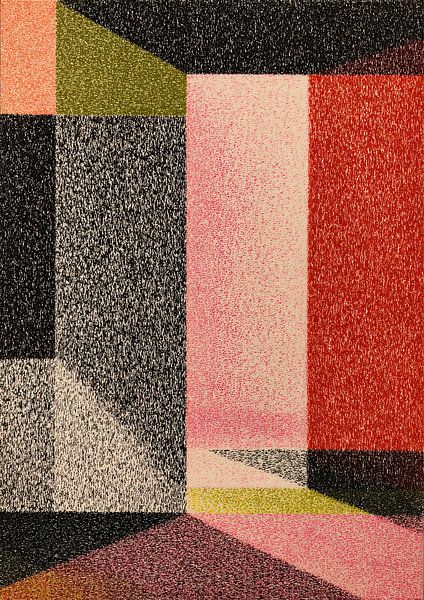Dieses abstrakte Kunstwerk nutzt feine Punktstrukturen, um eine geometrische, räumliche Komposition zu schaffen. Das Zusammenspiel von rosa, roten, olivgrünen und schwarzen Flächen deutet ein minimalistisches architektonisches Interieur an. Die pointillistische Technik verleiht den flächigen Formen eine lebendige Textur und Tiefe. Eine…