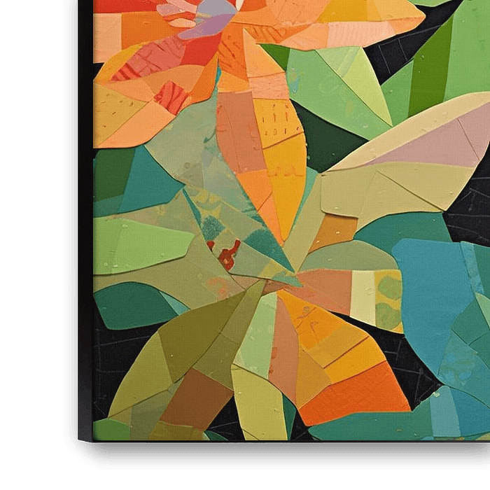 Geometric Chameleon - Dieses lebhafte Kunstwerk zeigt ein charmantes Chamäleon, das aus zahlreichen geometrischen Teilen besteht, die zusammen ein Mosaik bilden. Die Farben sind verspielt und reichen von zarten Grüntönen bis hin zu sanften Blautönen, wobei Akzente in Orange und Gelb einen warmen Kontrast bilden. Die detaillierte Komposition und die ausdrucksstarken Augen des Tieres ziehen sofort die Aufmerksamkeit auf sich.