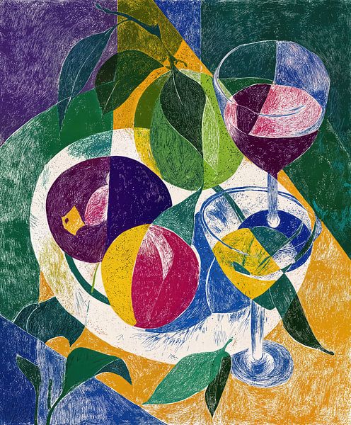 Ein lebhaftes, vom Kubismus inspiriertes Stillleben mit Früchten, Blättern und Weingläsern, das in markante geometrische Formen und kräftige Kontrastfarben zerlegt ist und so eine dynamische und moderne Komposition bildet