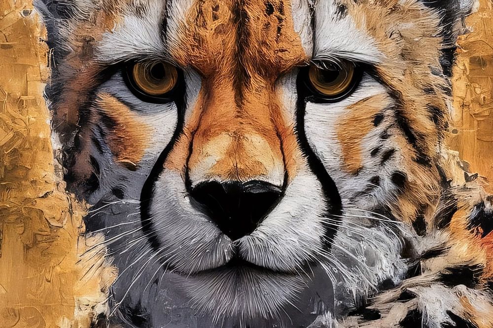 Dieses eindrucksvolle digitale Bild eines Geparden ist ein schönes Beispiel für moderne Kunst. Das detaillierte Gesicht des Geparden ist vor einem dynamischen Hintergrund voller Farben wiedergegeben, der die Blicke auf sich zieht. Der intensive Blick des Tieres und die verspielte Kombination von Orange-, Gelb- und Grautönen schaffen ein visuelles Meisterwerk, das perfekt in eine moderne Einrichtung passt. Ob Sie nun einen Blickfang für Ihr Büro, Ihr Schlafzimmer oder andere Räume suchen, dieses Kunstwerk bringt die Natur auf einzigartige Weise ins Haus. Die modernen und abstrakten Elemente des Hintergrunds verstärken den kraftvollen und majestätischen Charakter des Geparden.