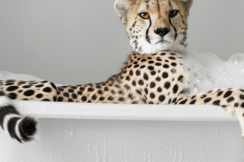 Dieses originelle Badezimmer Bild ist ein echter Blickfang! Mit einem fröhlichen Gepard, der die Ruhe in seiner Badewanne genießt, bringt es Charme und Witz in jedes moderne Badezimmer. Die schwarz-weiße Fotografie unterstreicht die zeitlose Eleganz, während die Szene selbst unter den lustigen Badezimmer Bildern eine Sonderstellung einnimmt. Ideal für die Gestaltung eines WC oder Badezimmers, erinnert dieses Werk daran, dass auch Tiere Toilette-Momente haben können. Diese moderne Badezimmer Bilder-Serie bietet eine unkonventionelle Dekoration, die sowohl zum Schmunzeln als auch zur Verschönerung des Badezimmers beiträgt. Mit diesem dekorativen Badezimmer Bild schaffen Sie eine einzigartige Atmosphäre und finden inspirierende Einrichtungsideen für Ihr WC.