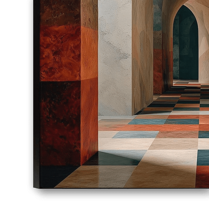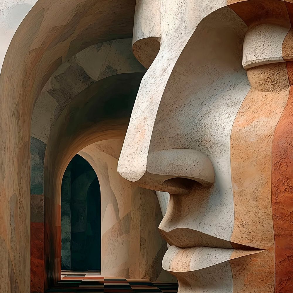 Ein surreales architektonisches Kunstwerk mit einem langen schmalen Korridor und einer großen abstrakten Skulptur eines menschlichen Gesichts mit fließenden Konturen und geometrischen Formen, die einen heiteren Ausdruck ausstrahlen. Der Korridor hat mehrere Bögen, die tiefer in den Raum hineinführen und die Tiefe und Perspektive betonen. Diffuses Licht beleuchtet den Korridor mit weichen Schatten, die die Dreidimensionalität des Gesichts und die Textur der Wände hervorheben. Eine verträumte Atmosphäre, die einladend wirkt.