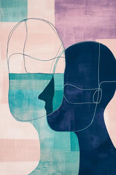 In sanften Farben verschmelzen zwei stilisierte Köpfe zu einem harmonischen Ganzen. Die klare Linienführung und die geometrischen Formen schaffen eine ansprechende Balance zwischen Modernität und Intimität. Ideal für das Wohnzimmer, wo es Gespräche anregt und eine kreative Atmosphäre fördert – perfekt, um inspirierende Gedanken ins…