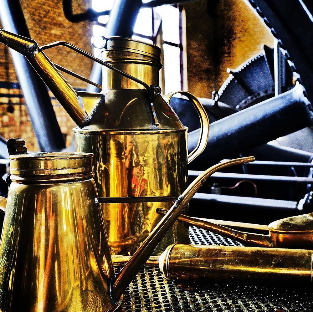 Diverse koperen kannen en spuiten welke gebruikt worden bij het door stoom aangedreven gemaal