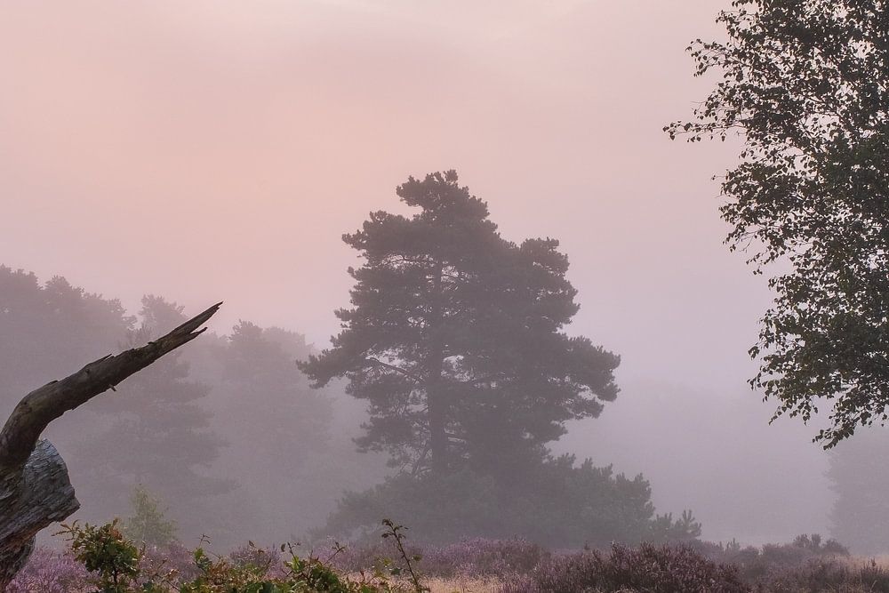 Stimmungsvolle Atmosphäre am frühen Morgen in einem nebligen Moor.