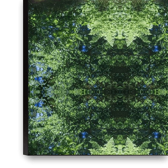 Diese gespiegelte Komposition ist dem entspannenden Ambiente am Flussufer und einer zauberhaften Reflexion inmitten des Waldes gewidmet. Hellgrüne Farnblätter, Bäume und das Blau des Himmels spiegeln sich im Wasser eines kleinen Flusses.