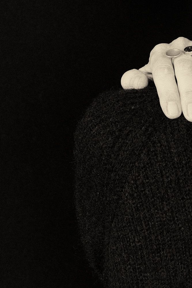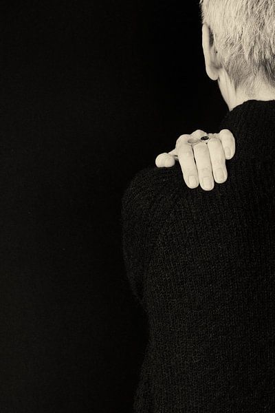 Eine kleine Geste kann viel aussagen. In diesem stillen Bild ruht eine Hand sanft auf einer Schulter, während sich die Figur vom Betrachter abwendet. Der dunkle Hintergrund und das tiefe Schwarz des Pullovers verstärken die Stille des Augenblicks. Das helle Haar und die Hand setzen subtile Akzente, die den Blick lenken.
