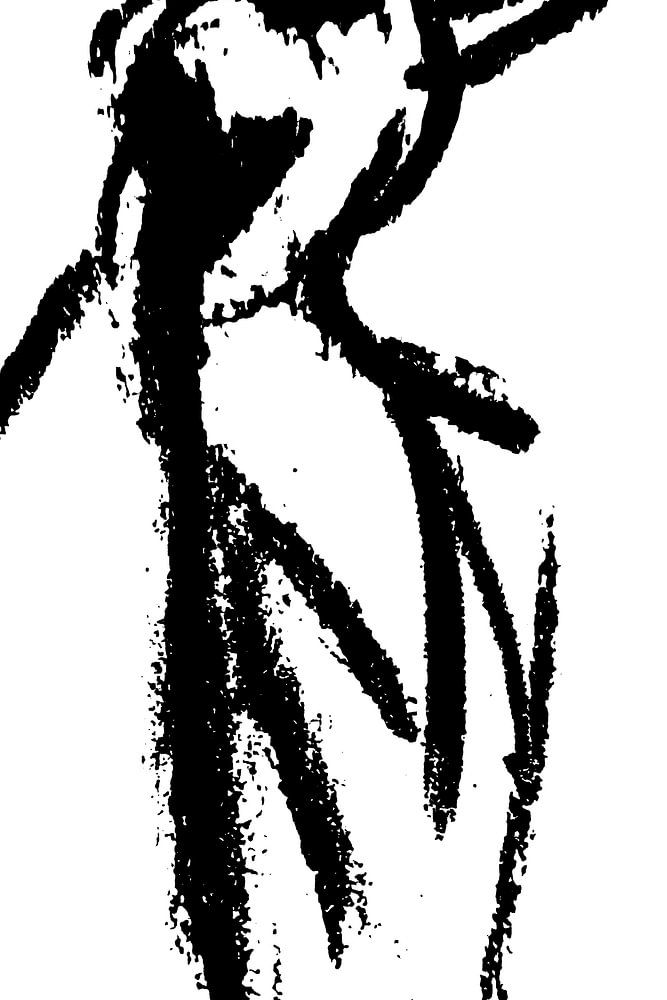 Schwarz-Weiß-Adaption einer Kohlezeichnung. Abstrakte Darstellung einer Frau, die einen Hut trägt.