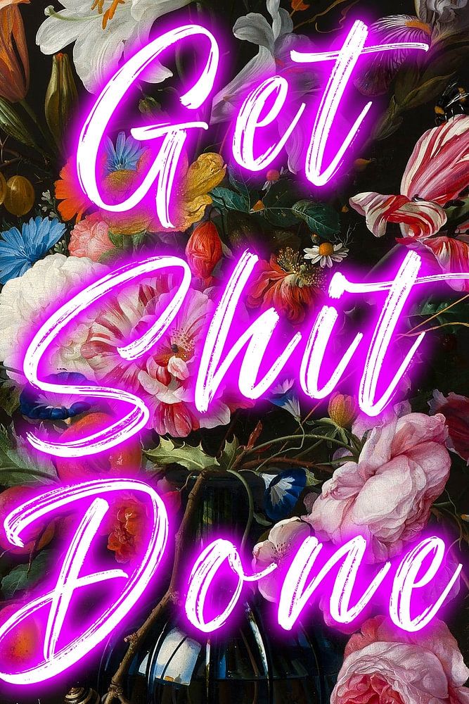 Get Shit Done - Blumen mit positivem lila Text. Eine sehr positive Erinnerung an dich selbst, nicht still zu sitzen und alles aus dem Leben herauszuholen, was du kannst. An die Arbeit gehen. Erledige die Arbeit. Stellen Sie selbst die Blumen auf und genießen Sie das Leben. Dieser positive Text geht derzeit aus gutem Grund viral und regt zum Nachdenken an.