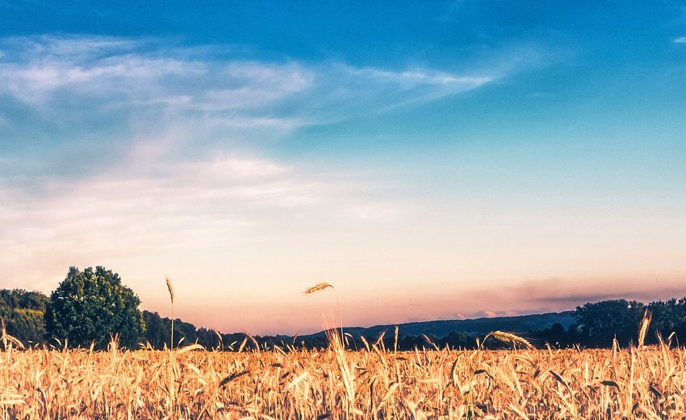 Getreidefelder in Polen im Sommer mit schönem, blauen Himmel und leichtem Wolkenband.