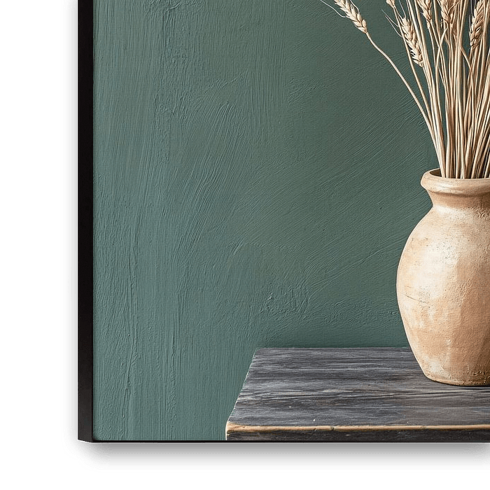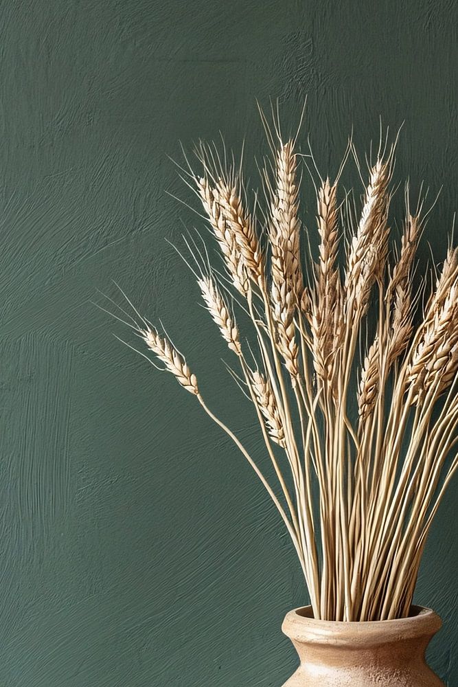 Dieses stilvolle Design strahlt Schlichtheit und natürliche Schönheit aus. Die rustikale Vase aus Ton enthält getrockneten Weizen, der perfekt vor einem tiefgrünen Hintergrund präsentiert wird. Das minimalistische Arrangement hebt Texturen und erdige Farben hervor und verleiht ihm einen zeitlosen Charme. Ideal für Einrichtungsstile wie Japandi, rustikal oder moderner Minimalismus. Es handelt sich um ein Highlight, das jedem Raum, vom Wohnzimmer bis zum Esszimmer, Harmonie verleiht.