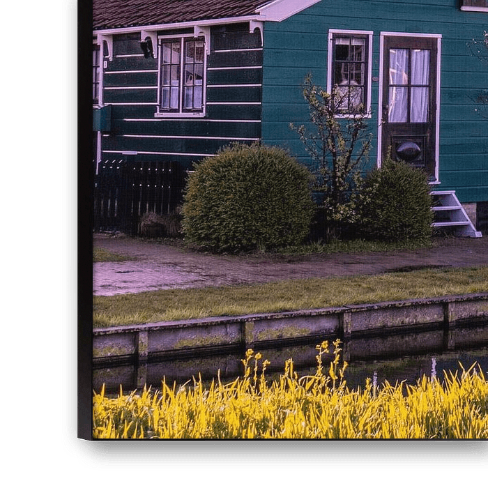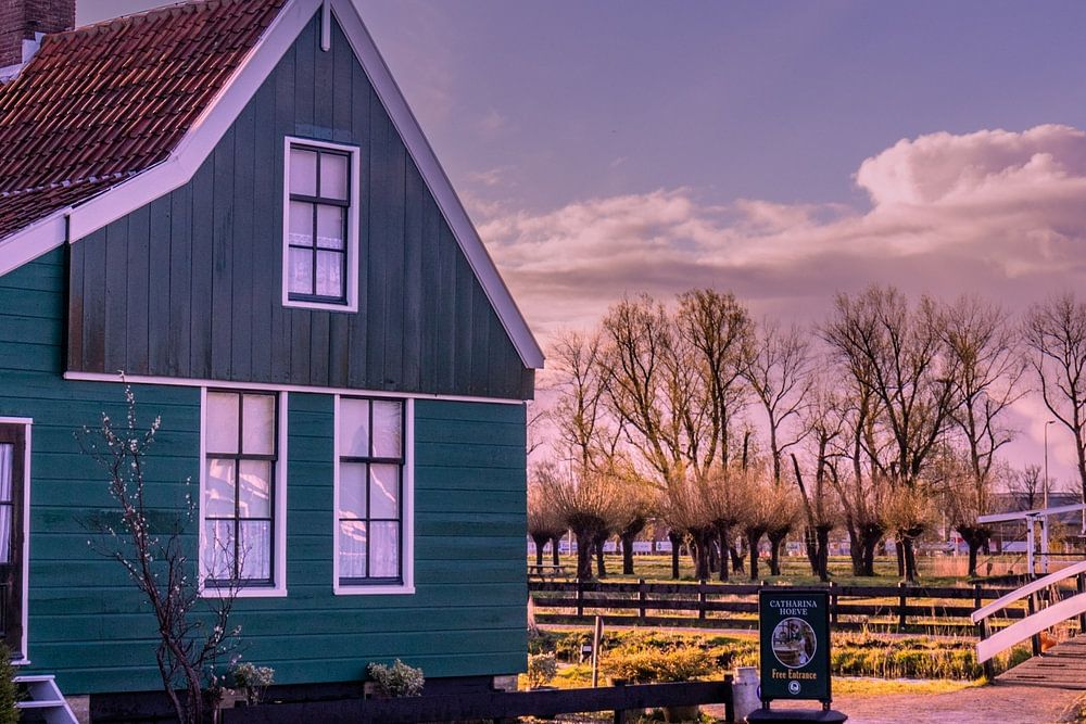 Ein typisches Gewächshaus an der Zaanse Schans in Zaandam. Das Foto wurde kurz nach Sonnenaufgang aufgenommen, was für stimmungsvolle Farben sorgt. Sie können auch die kleinen Kanäle und die Brücke auf der anderen Straßenseite sehen.