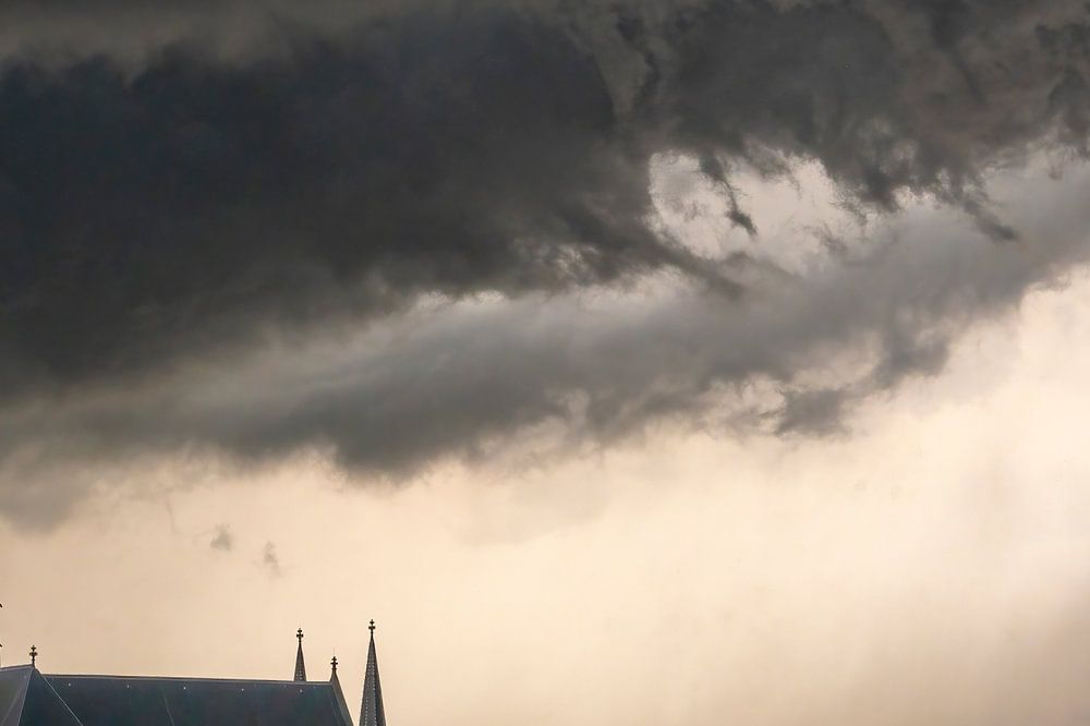 Gewitterwolken über Zwolle während eines Sommergewitters am Ende eines warmen und feuchten Sommernachmittags. Eine Regalwolke nähert sich über den Dächern und dem Dominicanenklooster.