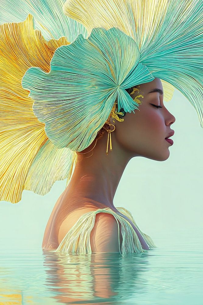 Ein surreales Kunstwerk, in dem natürliche und menschliche Elemente in einer ruhigen Wasserwelt verschmelzen. Ginkgoblätter in sanften Türkis- und Goldtönen bilden ein anmutiges Herzstück, während sich die Silhouette im ruhigen Wasser spiegelt. Die Komposition strahlt eine verträumte, fast meditative Ruhe aus, die durch die harmonische Farbpalette aus Aquamarin und Gold noch verstärkt wird.