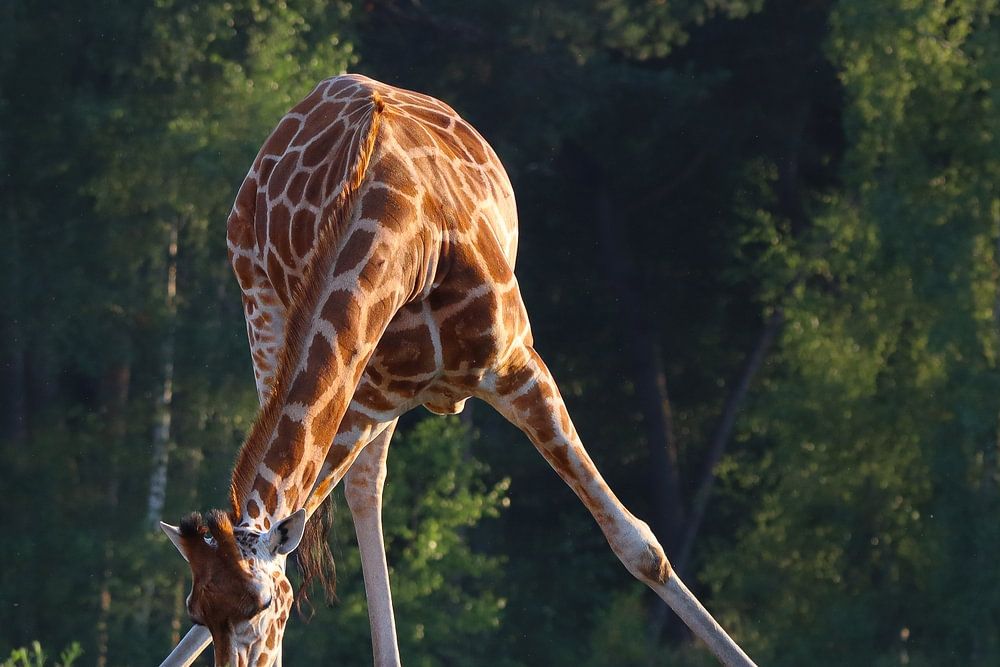 Dieses etwas komische Foto einer Giraffe, die versucht, etwas vom Boden zu essen, lädt dazu ein, bei einem Drink in entspannter Atmosphäre darüber zu sprechen, wie es zu dieser Situation kam.