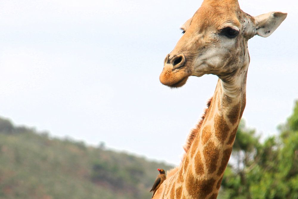 Giraffe met klein vogeltje op de rug gespot in het wildpark Hluhluwe-Imfolozipark in Zuid Afrika.