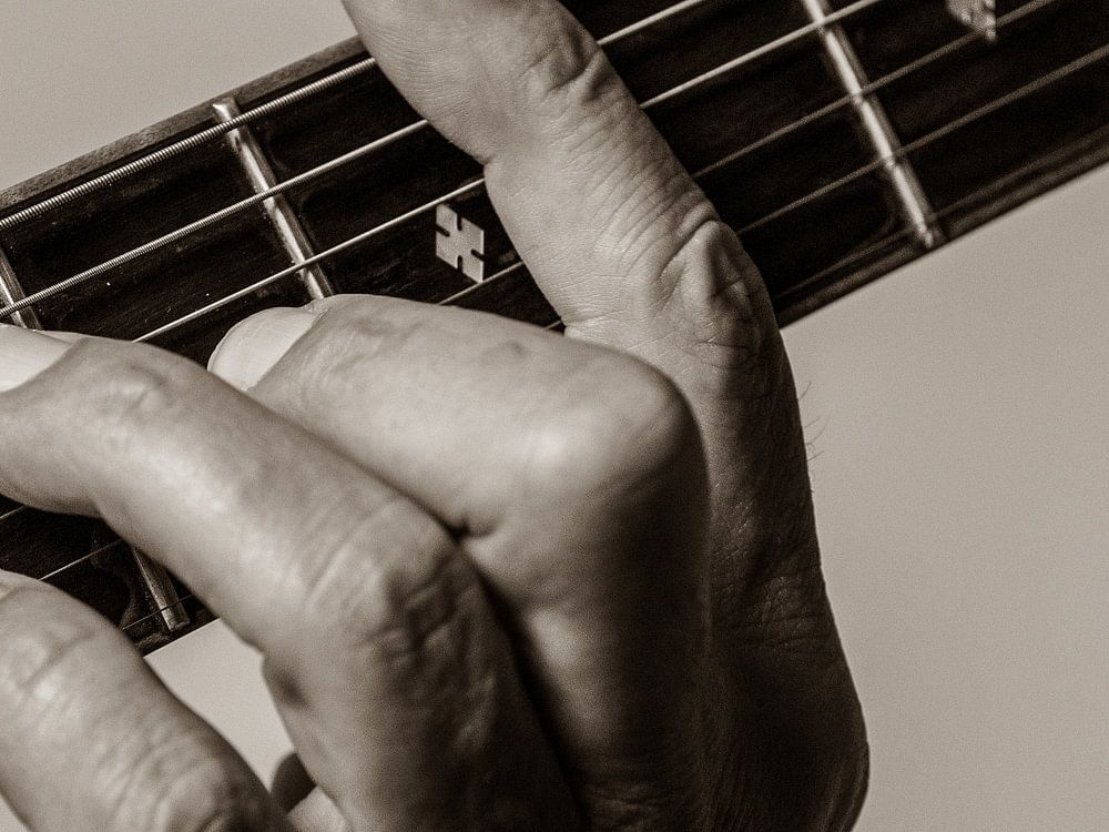 Eine Hand am Steg einer Gitarre eines Musikers.