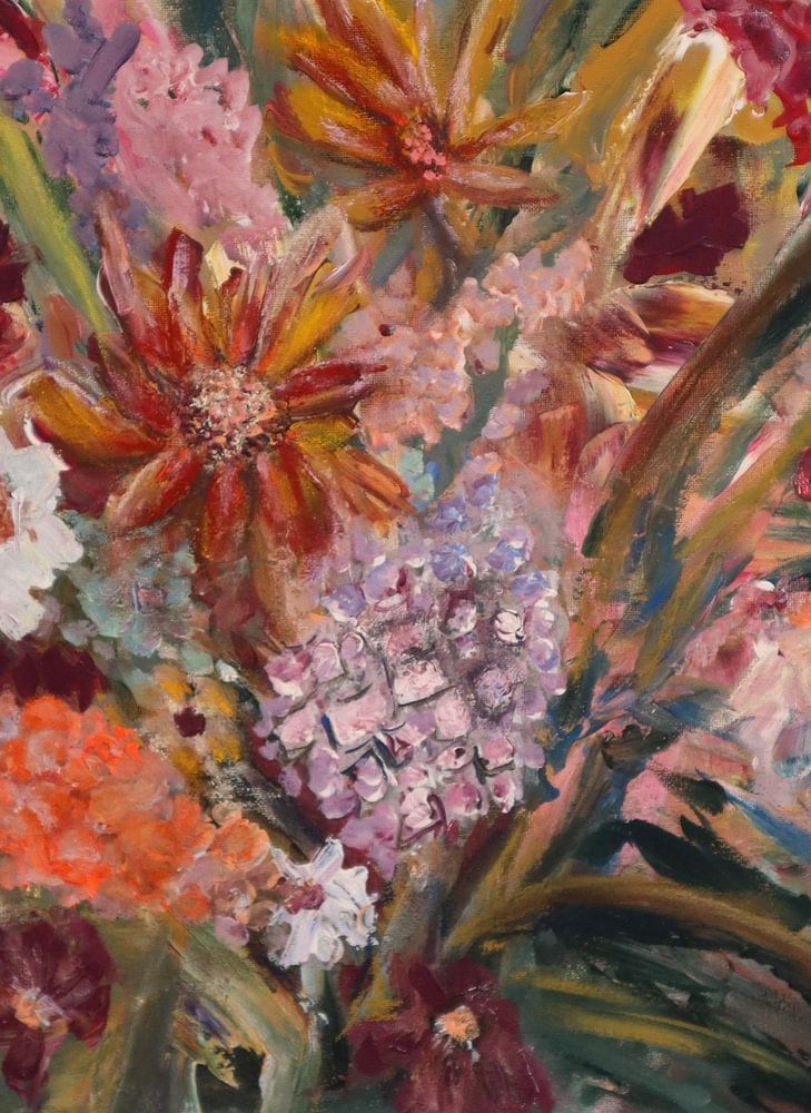 Feldblumenstrauß in Neonfarben mit allen möglichen Blumen des Landes. Was du in deinem Herzen bewahrst, vergeht nicht. Der Strauß entstand aus Erinnerungen an die Sommertage auf dem Feld, an denen man jeden Tag Blumen pflücken konnte. Der impressionistische Stil deutet darauf hin, dass es sich um eine Erinnerung handelt.