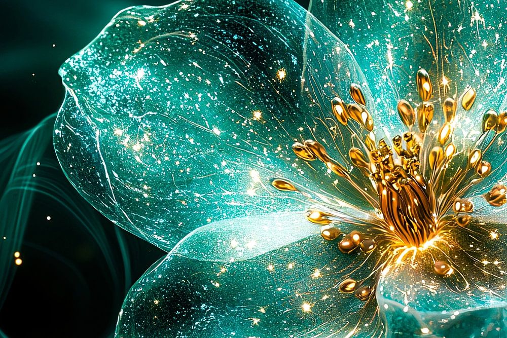 Dieses Design zeigt eine atemberaubende Blume mit funkelnden goldenen Details und einem geheimnisvollen grünen Schimmer. Die Verwendung von Licht und Textur macht es zu einem visuell beeindruckenden Kunstwerk, das perfekt zur Aufhellung eines Raumes geeignet ist. Die zarten Blütenblätter sind mit schimmernden Akzenten übersät, während der Hintergrund eine ruhige, verträumte Atmosphäre schafft. Ideal für moderne Interieurs und Liebhaber einzigartiger, auffälliger Wanddekorationen.