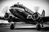 Ein glänzendes klassisches Propellerflugzeug schwebt tief über der Landebahn, mit drehenden Propellern und klaren Nietlinien, die das Metall zum Glänzen bringen. Die Schwarz-Weiß-Palette betont den Kontrast zwischen dem spiegelnden Rumpf und dem weichen, verschwommenen Hintergrund. Die Nase mit Lufteinlässen und symmetrischen Motoren…