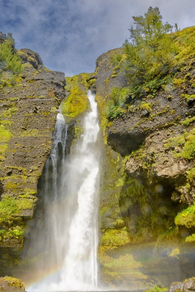Wasserfall Gluggafoss am Fluss Merkjá, auch bekannt als Merkjárfoss, in Südmittelisland an einem schönen Sommertag. Der Gluggafoss hat eine Gesamthöhe von etwa 52 m und besteht aus zwei Hauptfällen: Dies ist der höhere Fall von 44 m.