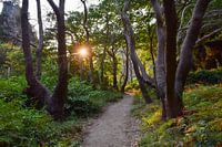 Die Abendsonne bricht durch die Blätter eines alten Baumbestands in der Acheron-Schlucht im Nordwesten Griechenlands.