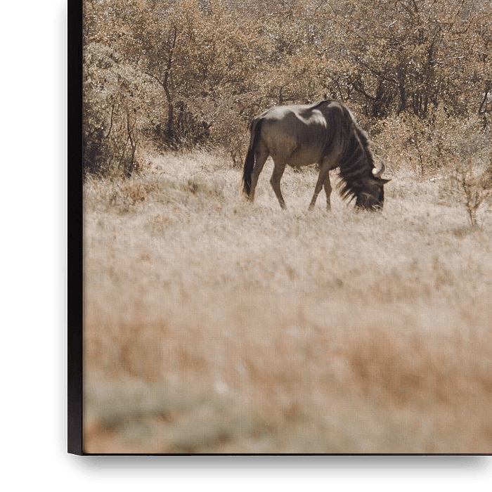Dieses atemberaubende Kunstwerk fängt die Essenz der afrikanischen Savanne ein, in der sich ein einsames Gnu über das goldene Grasland bewegt. Mit seinem robusten Körperbau und den markanten gebogenen Hörnern ist das Gnu ein wahres Symbol für Ausdauer, das der rauen und doch wunderschönen Landschaft Afrikas trotzt. Die warmen Töne der…