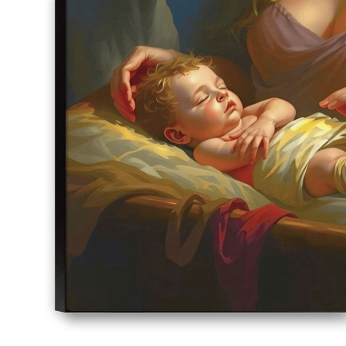 Dieses eindrucksvolle Kunstwerk fängt einen zarten und kraftvollen Moment der griechischen Mythologie ein: Die Göttin Rheia beschützt ihren neugeborenen Sohn Zeus vor dem Zorn des Kronos. Rheia wird mit wallendem blondem Haar und heiterem Gesichtsausdruck dargestellt und verkörpert göttliche Anmut und mütterliche Stärke. Sie trägt ein weiches, lavendelfarbenes Kleid, das sie elegant umhüllt und die ätherische Atmosphäre der Szene unterstreicht. Schützend ruhen ihre Hände auf dem kleinen Zeus, der friedlich in einer hölzernen Wiege liegt, eingehüllt in ein warmes, gelbes Tuch. Sein engelsgleiches Gesicht und sein lockiges Haar vermitteln Unschuld und Verletzlichkeit.