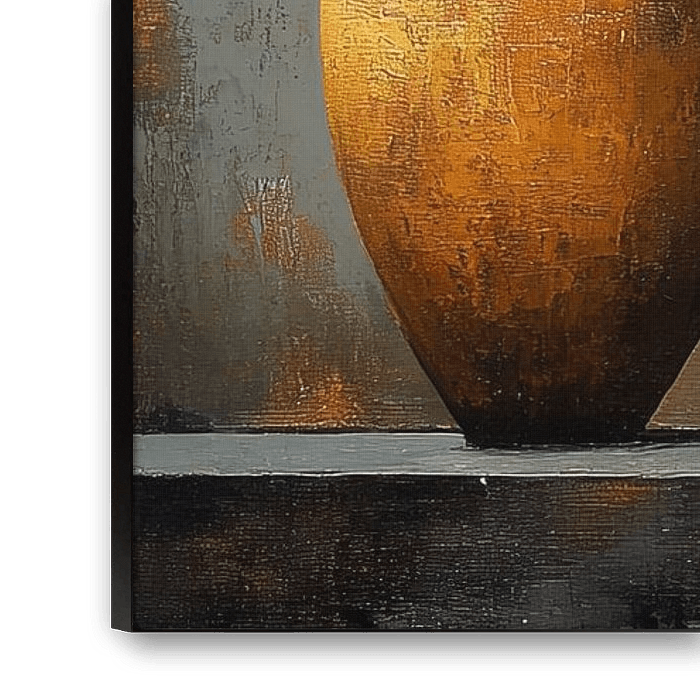 Stillleben Vasen mit Goldhintergrund - Dieses Stillleben zeigt eine Reihe von fünf eleganten Vasen in einer Reihe, die vor einem reich strukturierten Goldhintergrund hervorgehoben sind. Die Vasen reichen in ihren Farben von tiefem Blau und Schwarz bis zu leuchtendem Orange und Gelb.