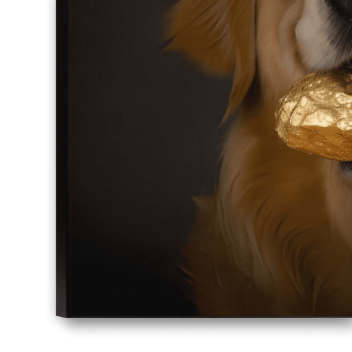Auf dem Bild ist ein wunderschöner Golden Retriever zu sehen. Der Hund hält stolz ein riesiges, glänzendes Goldnugget in seinem Maul, als wäre es ein Spielzeug für ihn. Das Goldstück strahlt förmlich vor Wärme und Helligkeit, was dem Bild einen luxuriösen und majestätischen Touch verleiht. Der Blick des Hundes ist ruhig und entspannt und er scheint den vermeintlichen Schatz in seinem Maul sehr zu genießen. Das Bild vermittelt eine warme, entspannende und unbeschwerte Atmosphäre und lädt den Betrachter ein, sich zu entspannen und zu träumen.