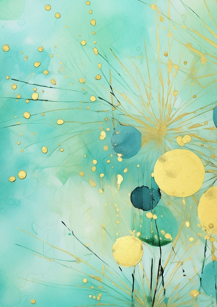 Abstraktes Bild von Kreisen und Linien auf einem verblassten aquagrünen und blauen Hintergrund. Gold für einen spritzigen Effekt. Passt zu verschiedenen Stilen und Trends.