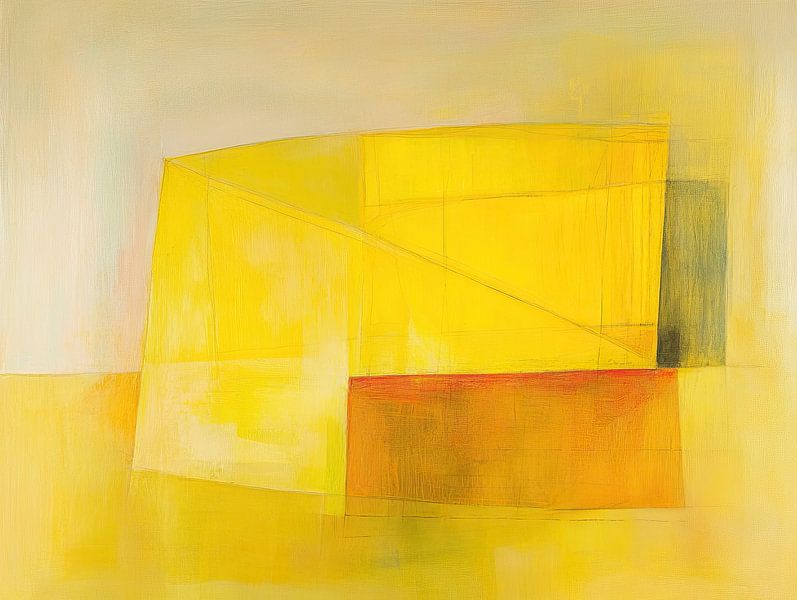 Golden Block Study – Dieses abstrakte Gemälde zeigt einen großen gelben Block als dominierende Fläche und darunter ein warmes orangefarbenes Rechteck in einer geometrischen, minimalistischen Komposition mit feinen Bleistiftlinien und einem sanften cremefarbenen Hintergrund, ideal als abstraktes Gemälde oder abstraktes Gemälde in Gelb…