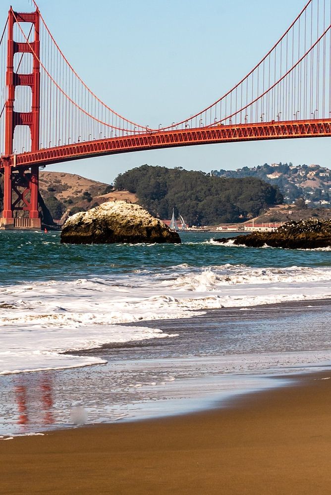 Golden Gate Bridge am Strand von Baker Beach in San Francisco Kalifornien USA
