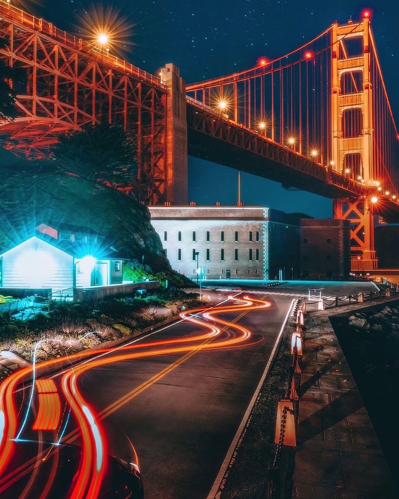 Die Nacht senkt sich über das Hafenviertel, während die Golden Gate in warmem Licht erstrahlt. Rote und weiße Spuren ziehen sich entlang der Straße, zeichnen den Weg der Autos nach und lenken den Blick auf den Turm und den sternenübersäten Himmel. Ein helles Haus am Hang verleiht dem Bild eine menschliche Dimension und bildet einen Kontrast zu den tiefen Blautönen der Nacht. Die Komposition verbindet Bewegung und Stille, Wasser und Stahl und schafft so einen lebendigen Rhythmus im Bild.