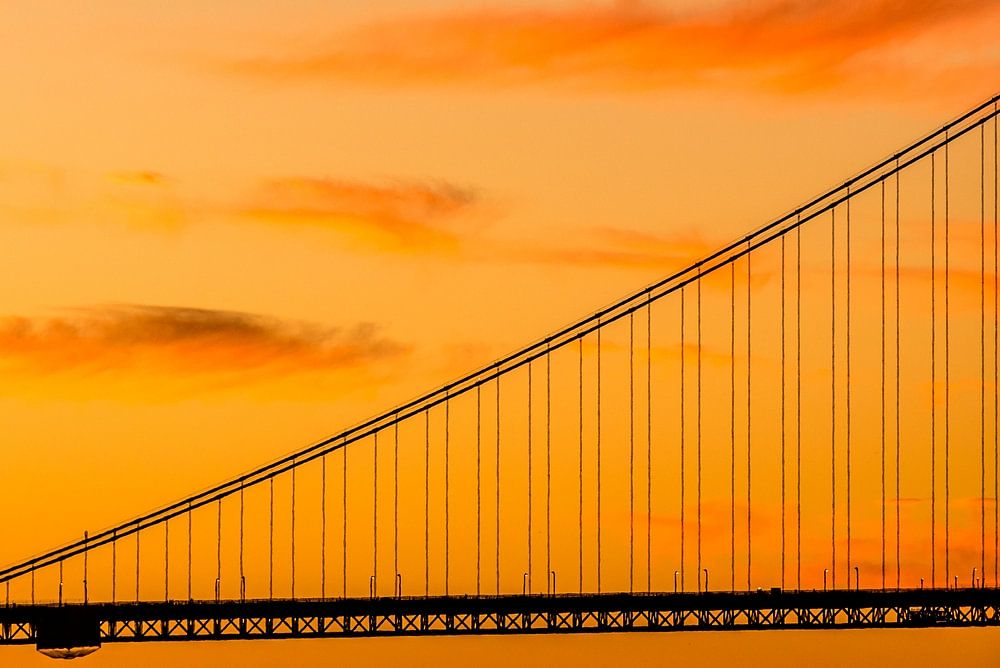 Goldener Sonnenuntergang mit Silhouette und Auschnitt der Golden Gate bridge in der Bay Area San Francisco Kalifornien USA