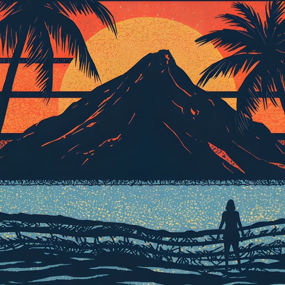 Erleben Sie die heitere Schönheit eines tropischen Sonnenuntergangs mit diesem atemberaubenden Retro-Design. Ein einsamer Paddelboarder gleitet friedlich über das ruhige Wasser und hebt sich von einem leuchtenden, gestreiften Horizont und der untergehenden Sonne ab. Flankiert von ikonischen Palmen und einem entfernten Berg, fängt dieses Kunstwerk die Ruhe und Schönheit der goldenen Stunde an einem einsamen Strand perfekt ein. Ideal für Surfer, Paddelboarder, Strandliebhaber und alle, die Vintage-Reisekunst und den friedlichen Rhythmus des Insellebens zu schätzen wissen.