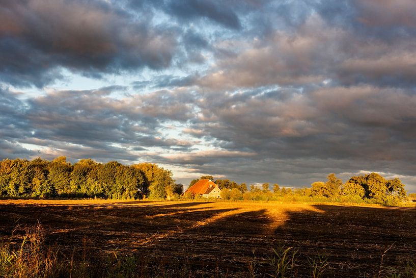Goldenes Licht in der Abendsonne über einem Bauernhof im Norden von Groningen in die Niederlande.