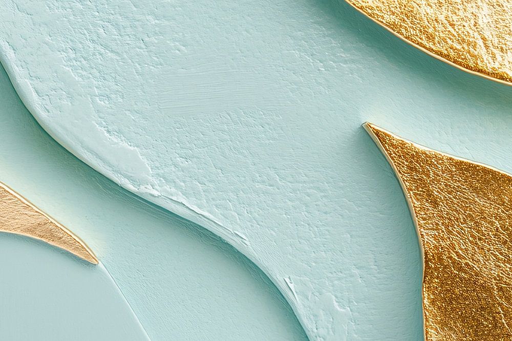 Dieses einzigartige Design kombiniert sanfte Pastellfarben mit klaren, modernen Formen und einem Hauch von Luxus durch die goldenen Metallic-Akzente. Das Muster besteht aus gewellten Linien, die elegant über den Hintergrund laufen und ein Gefühl von Raffinesse und Ruhe ausstrahlen. Die Kombination aus weichen Texturen und schimmerndem Gold macht es zu einem perfekten Dekorationsstück für einen modernen Einrichtungsstil. Das Design ist ideal für Räume, die einen subtilen und dennoch stilvollen Look wünschen, wie z. B. ein Schlafzimmer, ein Büro oder ein Wohnzimmer. Die abstrakten Formen und der Farbkontrast zwischen dem glänzenden Gold und dem sanften Hellblau sorgen für einen fesselnden visuellen Effekt, der sowohl beruhigend als auch inspirierend ist.