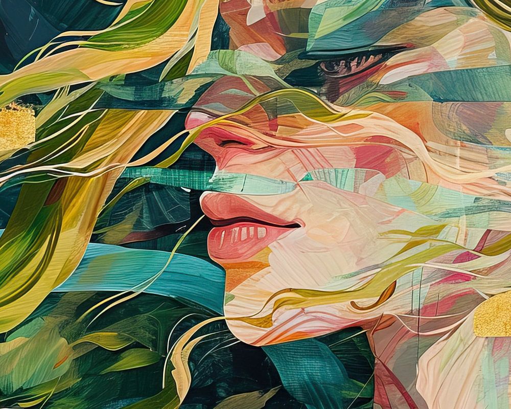Golden Leaves - Dieses lebendige Gemälde fängt ein Gefühl von natürlicher Dynamik ein, indem es ein Porträt in eine abstrakte Landschaft einfügt, in der Blätter die weichen Konturen eines Gesichts zu umspielen scheinen. Die Komposition besteht aus Schichten durchscheinender Farben und Goldakzenten, die zusammen ein harmonisches Zusammenspiel bilden, das sich mühelos zwischen Figur und natürlichen Elementen bewegt.