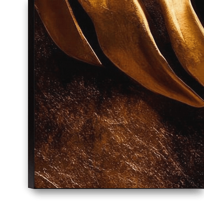 Glänzende Blattadern in strahlendem Gold entfalten sich wie Kunstwerke der Natur, die das Licht mit majestätischem Glanz reflektieren. Ihre geschwungenen Formen fangen den Betrachter ein und laden zu einem Spiel der Texturen ein, während der warme Untergrund eine harmonische Verbindung zur üppigen Tropenwelt suggeriert. Ein…