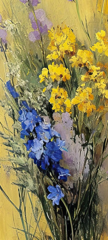 Golden Floral Beauty | Golden Flower Still Life - Hier sehen wir eine zarte Blumenkomposition vor einem sonnigen goldenen Hintergrund, der Ruhe und Wärme ausstrahlt. Die Textur verleiht den seidigen Blütenblättern eine taktile Qualität und lässt den impressionistischen Stil für sich selbst sprechen. Die dominierenden goldgelben Farbtöne werden durch violette und blaue Akzente wunderbar ergänzt und verleihen dem Bild einen eleganten und zugleich rustikalen Charme.