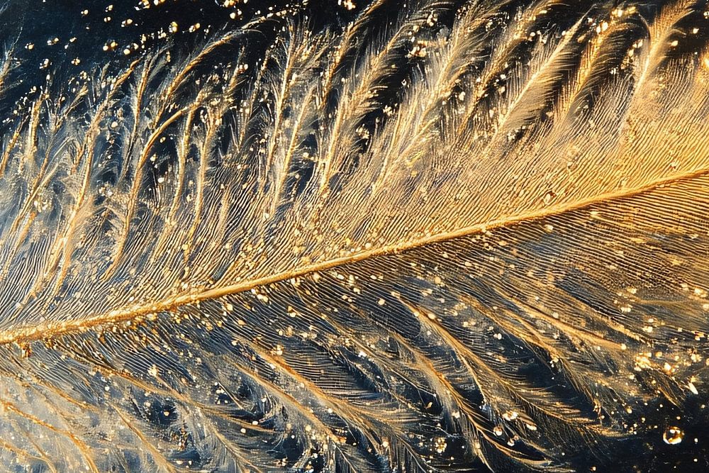 Ein elegantes und raffiniertes Design mit einer einzelnen goldenen Feder, die vor einem dunklen Hintergrund mit subtilen Blasen um sie herum glänzt. Dieses Kunstwerk strahlt ein Gefühl der Ruhe und Raffinesse aus, perfekt für ein modernes Interieur. Der sanfte Glanz der Feder und die hellen Blasen schaffen eine heitere und luftige Atmosphäre, so dass dieses Gemälde eine wunderbare Ergänzung für jedes Wohn- oder Esszimmer sein kann. Dank seines minimalistischen Stils passt es zu einer Vielzahl von Einrichtungsstilen, und die goldenen Akzente bringen einen Hauch von Luxus und Wärme in den Raum.