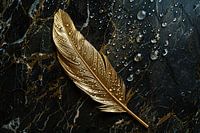 Über „Goldene Feder mit Wassertropfen auf dunklem Marmor“ von Art & Soul Creations