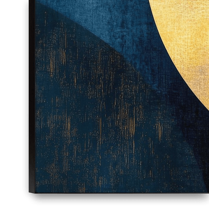 Schimmernde Goldtöne verschmelzen mit tiefen Blau- und Weißnuancen zu einem faszinierenden Zusammenspiel geometrischer Formen. Die harmonische Anordnung der geschwungenen Linien strahlt Ruhe und Eleganz aus, was dieses Kunstwerk perfekt für ein stilvolles Wohnzimmer macht, wo es anziehende Gespräche und eine inspirierende Atmosphäre…