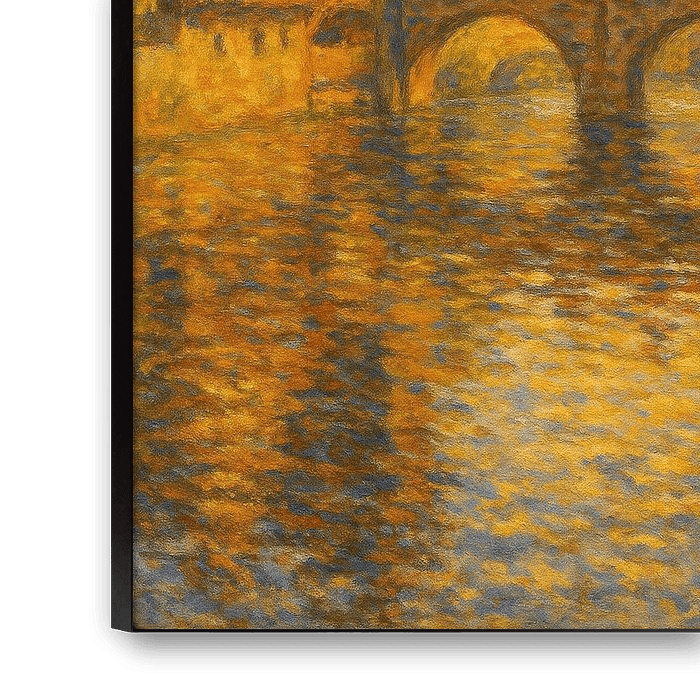 Dieses Kunstwerk lädt den Betrachter ein, in seiner vielschichtigen Leuchtkraft zu verweilen. Jede Reflexion, jeder Bernstein- und Indigofarbton wirkt lebendig, voller Geschichte und Atmosphäre. Die Texturen erinnern an das Summen des Abends - wenn die Straßen still werden, die Glocken widerhallen und das Wasser zu einem Hüter des Lichts wird.