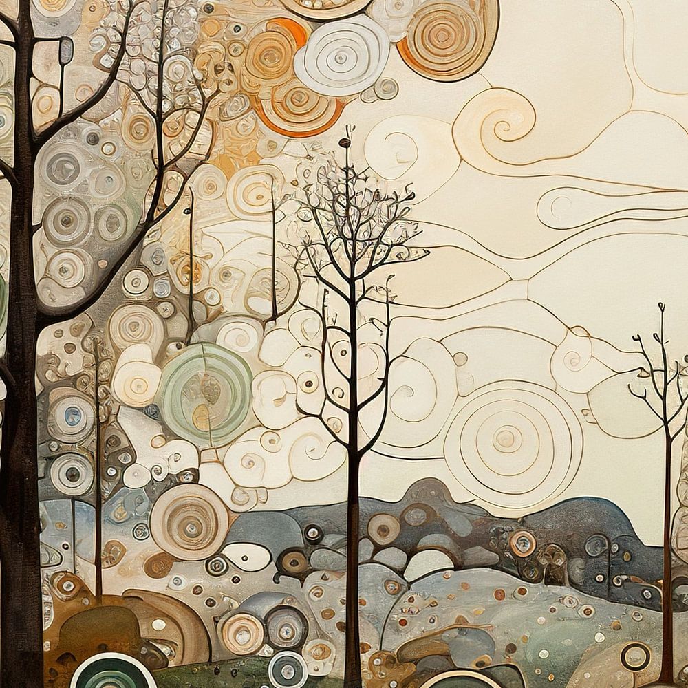 Goldene Hügel - Die Leinwand zeigt eine stark abstrahierte Landschaft, angereichert mit organischen, kreisförmigen Mustern, die für Bäume und Hügel typisch sind. Warme Erdtöne und subtile goldene Akzente dominieren, während das Zusammenspiel der Linien ein Gefühl von Bewegung und Tiefe erzeugt.