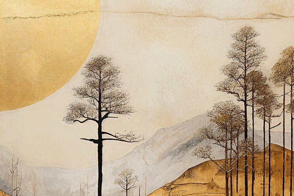 Moderne Malerei, minimalistische Landschaft mit goldenen Akzenten, stilvoller Minimalismus