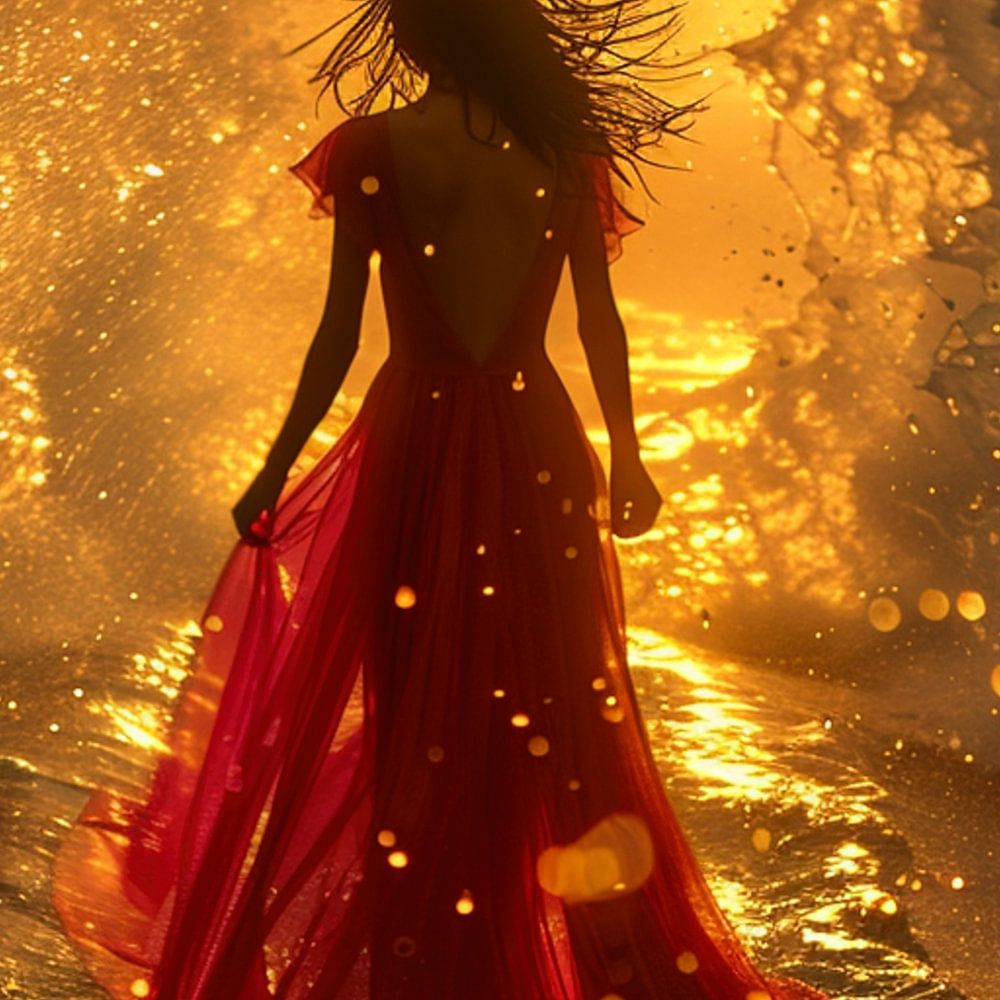 In diesem Werk wird die Textur des Stoffes lebendig und jede Welle und Falte des Kleides erzählt ihre eigene Geschichte. Die goldenen Sonnenstrahlen spiegeln sich auf der Wasseroberfläche und erzeugen einen ätherischen Glanz, der die gesamte Szene einhüllt.
